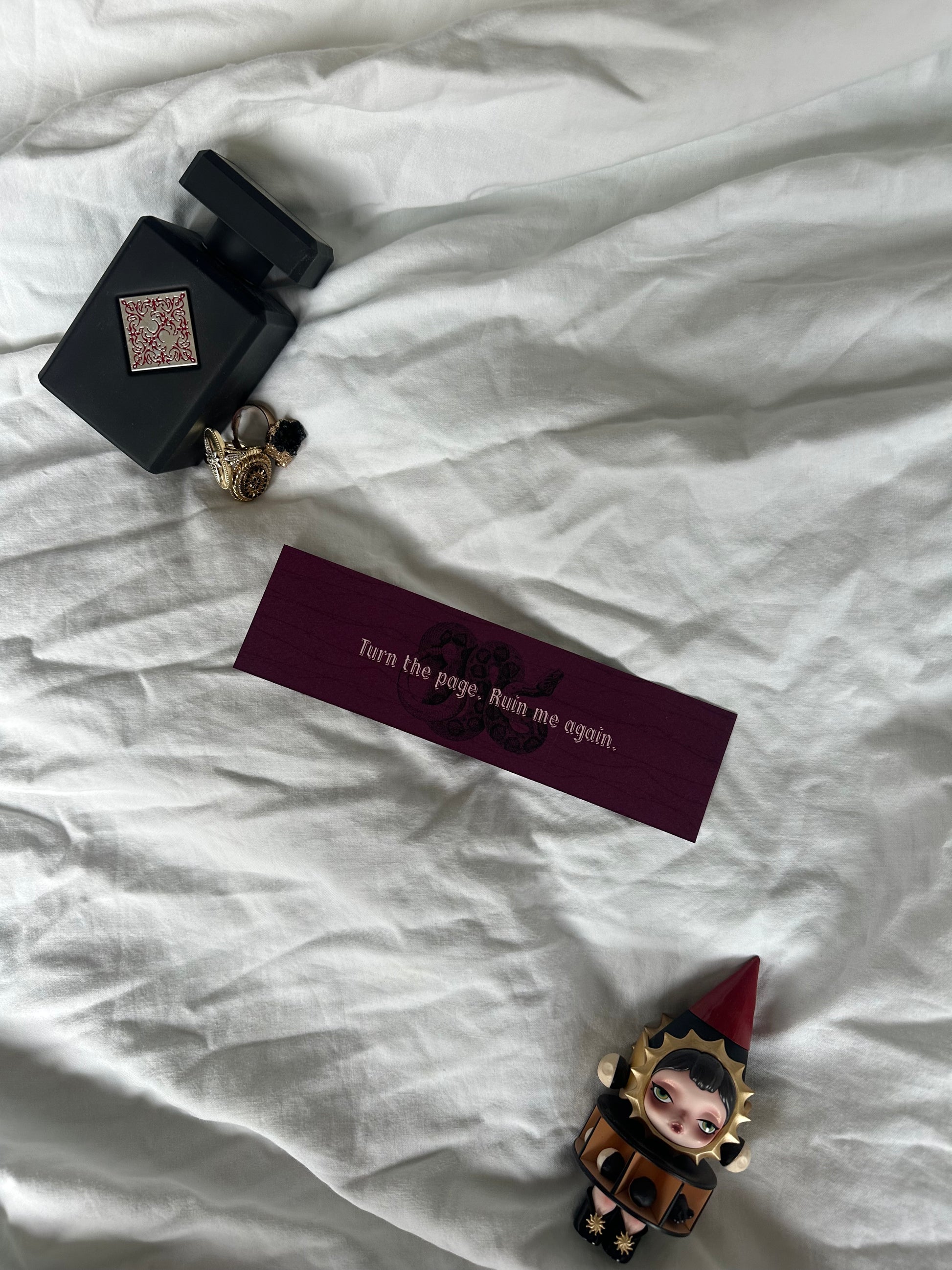Turn the page. Ruin me again. Bookmark > The option to add a beaded cord.